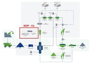 • Soluble high purity crystalline SOP containing 45% K is produced at low temperatures after the cesium sulphate precipitation.